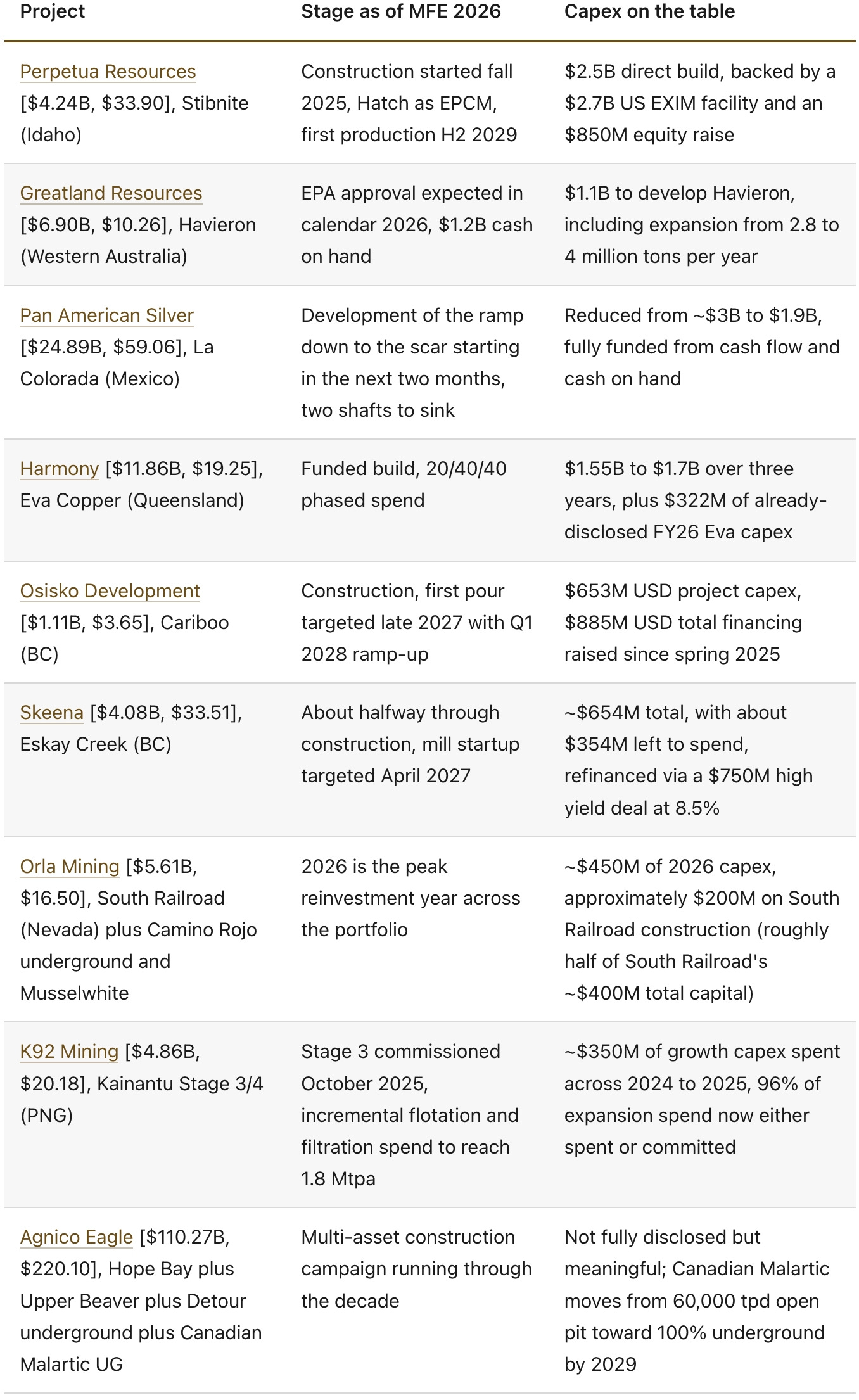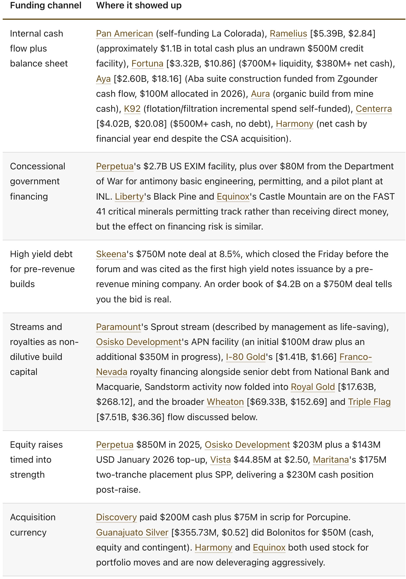 For a capital allocator working in this sector, the corporate presenters at MFE 2026 pointed toward a handful of clear preferences. Producers that are self-funding growth while returning cash look very well positioned, and Ramelius, Pan American, Fortuna, Aya, K92, and Orla are the names that warrant closer work. Developers with modular mine plans, short paybacks, and a non-dilutive funding component look more investible than the traditional large-build stories, and Q Gold, Amex, Liberty, Lahontan, Tesoro, and Rio2 (just in production) fit that profile. Operators of brownfield acquisitions that are now turning into hub-and-spoke systems are the quiet compounders of the cohort, with West Red Lake, Maritana, Minera Alamos, and Discovery all fitting the description. The large, genuinely capital-intensive builds (Perpetua, Greatland, Harmony‘s Eva Copper, Osisko Development) will be defined by execution rather than financing, and construction metrics should come into view before sizing decisions. Streamers look structurally well-positioned to keep compounding through the cycle, with Wheaton, Royal Gold, and Triple Flag all describing deal pipelines that the equity market has not fully priced in. IAMGOLD [$11.21B, $19.25] sits in the same category, where execution reporting will matter more than model optionality.