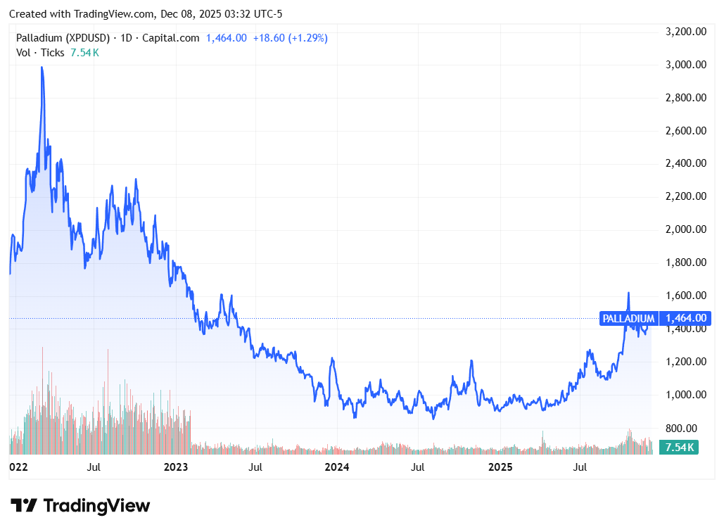 In the case of palladium, it reached an all-time high of US$3440 an ounce in early 2022 due to Russia’s invasion of Ukraine but has languished at below US$1000/oz for parts of 2024 and 2025.