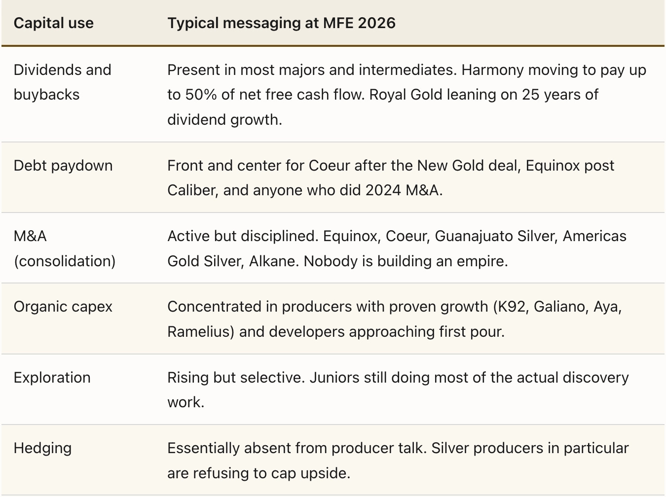 Across the sixty-three company presentations I tracked, the posture was remarkably uniform. Here is the rough distribution of how producers are talking about their cash.