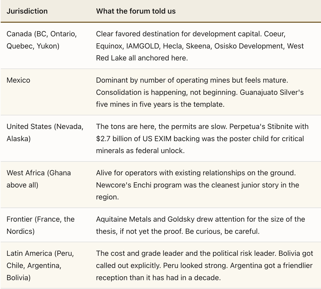 Nobody defended single jurisdiction concentration as a feature. Those that had it apologized for it implicitly by offering exploration optionality elsewhere.