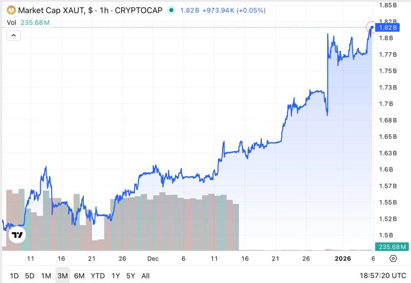 The slower growth reflects not a lack of demand but a recognition of physical market limits that don't apply to purely financial instruments. For example, even a small investment from USDT into gold-backed tokens would imply tens of billions of dollars in additional bullion demand, which the physical market simply cannot accommodate.